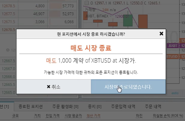 붉은색 '시장가' 버튼 누르면 시장가에 바로 팔아지는것이고. 왼쪽 흰색박스에 가격입력하고 닫기 누르면 지정가격 도달시 종료합니다.