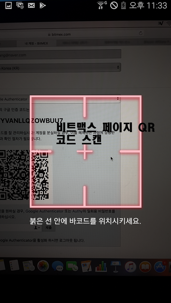 핸드폰이 컴퓨터 QR 코드를 바로 인식하면서, 비트맥스와 핸드폰 구글 OTP가 연동됩니다.