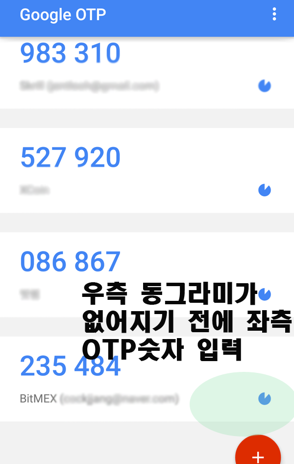 구글 OTP 사용법 말씀드리면 우측에 동그라미는 10초 간격으로 생성됩니다.