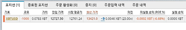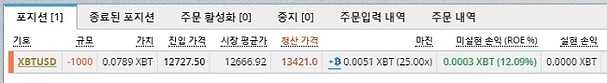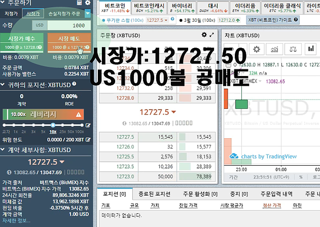 비트맥스에서 시장가격(12727.5)로 US1000 공매도를 칩니다.