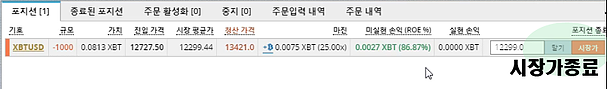 공매도는 빠져야 수익이 나며, 미실현 수익에 86.87% 초록색 불들어 왔습니다. 그럼 우측 '시장가' 붉은색 버튼 클릭하시면 시장가로 익절됩니다.