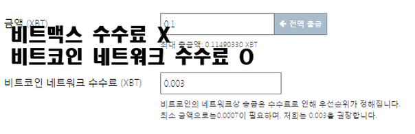 거래소에서 비트맥스로 비트코인을 전송하거나 비트맥스에서 거래소로 출금을 할때 수수료가 발생합니다.