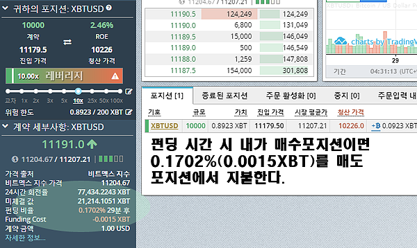 이가 말하는바는 29분 후 펀딩시간이 되면 포지션 가치의 0.01702%인 0.0015XBT를 차감하겠다는 뜻으로