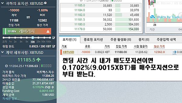 하면 그 반대겠죠.초록색 글짜로 표시되면서 0.0015XBT 금액을 펀딩시간 시 받게 됩니다.