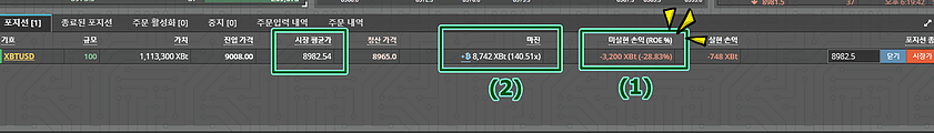 (2)박스 : 마진 수량이 자동 청산 되어 13,142XBT 에서 -> 8,742XBT 로 변경 되었으며 레버리지는 증거금 현재 잔액 대비 140.51x 로 올라감