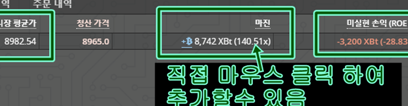 그림과 같이 마진을 추가 하여 증거금을 더 채워넣어 계약을 강제청산 으로 부터 보호할수도 있으며