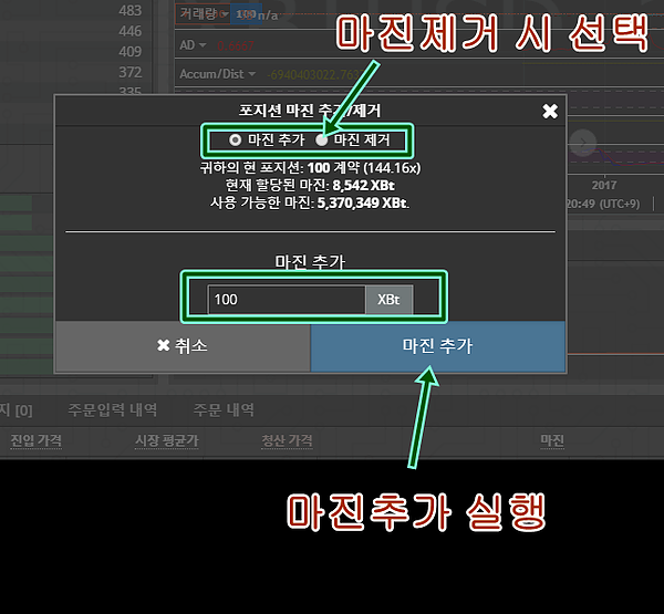 줄어든 8742XBT 에 추가로 증거금 넣습니다. 아래 사진과 같이 마진 추가 / 제거 창 이 뜹니다.
