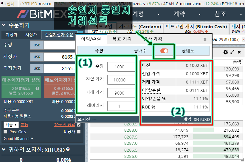 우선 화살표 처럼 숏인지(공매도)롱(공매수) 인지 부터 커서를 좌우로 옮겨서 선택해 주시구요.